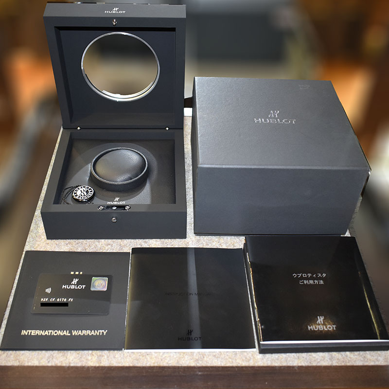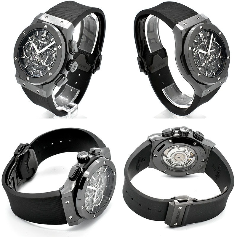 | 店長メモ | 45mmのセラミックケースにクロノグラフを搭載し、ダイアルをスケルトンにした斬新なデザインが特徴のアエロフュージョンです。 ケースやリューズ、ベルト等を黒で統一したブラックマジックモデルです。 色気を放つ大人向けのウブロとして大変人気の高い1本です。 |