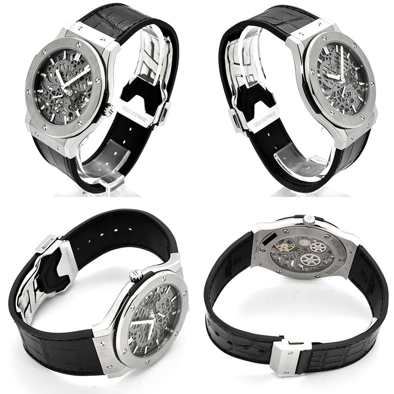 TOPウブロ ウブロ HUBLOT クラシックフュージョン クラシコ ウルトラシン スケルトン 515.NX.0170.LR 45mm USED 中古 参考定価: ¥1,760,000(税込) 価格: ¥898,000 (税込) 販売期間: WOC2年保険: 選択してください 加入する(+¥28,600-) 加入しない 数量: 本 在庫: 在庫切れ ※価格は前回価格です。 在庫 在庫切れ ※価格は前回価格です。 WOC2年保険加入する(+¥28,600-)加入しない 商品詳細 DETAILSブランドウブロ HUBLOT商品名クラシックフュージョン クラシコウルトラシン スケルトン515.NX.0170.LR状態USED 中古 *当店で外装仕上げ済みです。ケース径45mm材質チタニウム機械手巻き文字盤スケルトンベルト革/ラバー付属品箱 国際保証書(日付等未記入)*画像に載っている物で全てです保証6ヶ月店長メモ45mmのチタニウムケースに厚さ僅か2.9mmの手巻きムーブメントを搭載しています。 文字盤とケースバック共にスケルトン仕様で、見ているだけで楽しくなってしまう様な時計を是非手に取ってご覧ください。 【関連商品】 ウブロ HUBLOT クラシックフュージョン チタニウム 511.NX.8970.LR グリーン 45mm USED 中古 日本定価: ¥1,111,000(税込) ¥658,000(税込) 在庫切れ ※価格は前回価格です。 ウブロ HUBLOT クラシックフュージョン ブラックマジック 511.CM.1171.RX 45mm セラミック USED 中古 日本定価: ¥1,342,000(税込) ¥638,000(税込) 在庫切れ ※価格は前回価格です。 ウブロ HUBLOT クラシックフュージョン パールピンク ダイヤモンド 581.NP.6210.LR.1204.JPN17 33mm クォーツ 日本限定 USED 中古 参考定価: ¥1,331,000(税込) ¥698,000(税込) 在庫切れ ※価格は前回価格です。