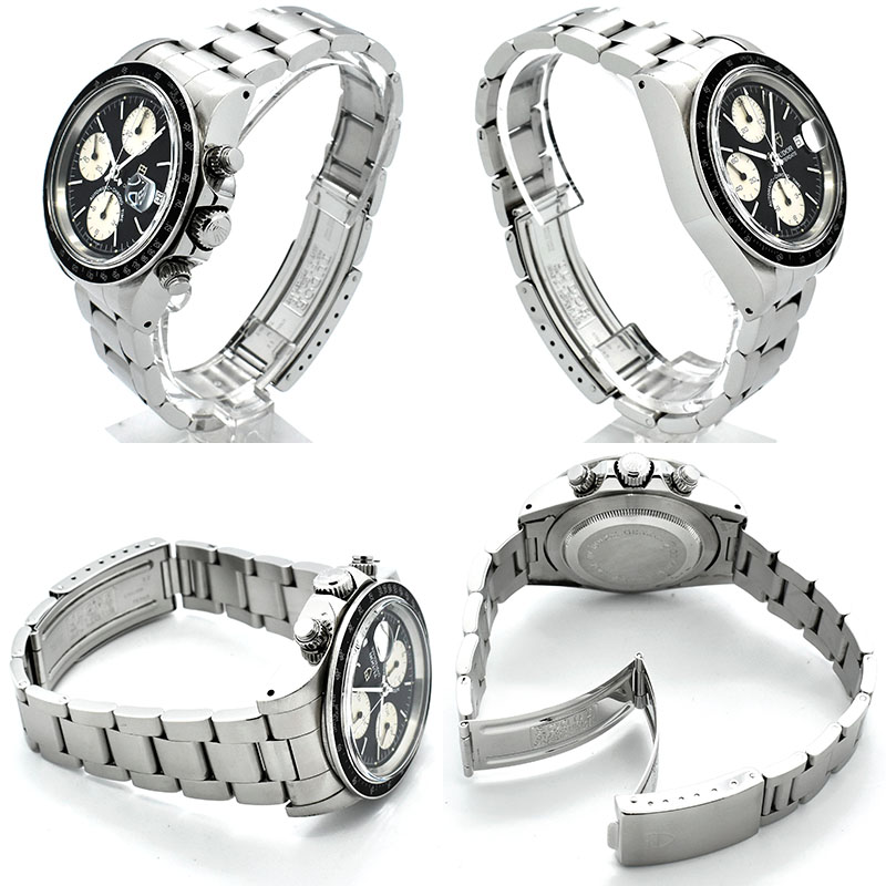 | 店長メモ | 【B番】 ケース径40mmの通称「カマボコケース」にクラウンリューズを備え、プラスチック風防に本家デイトナには無いデイト表示までが搭載されています。 市場の流通量自体が少なくなってきている上に、この個体のように保証書が付属する物は更に希少です。 お探しされていた方はお早めにお問合せください。 |
