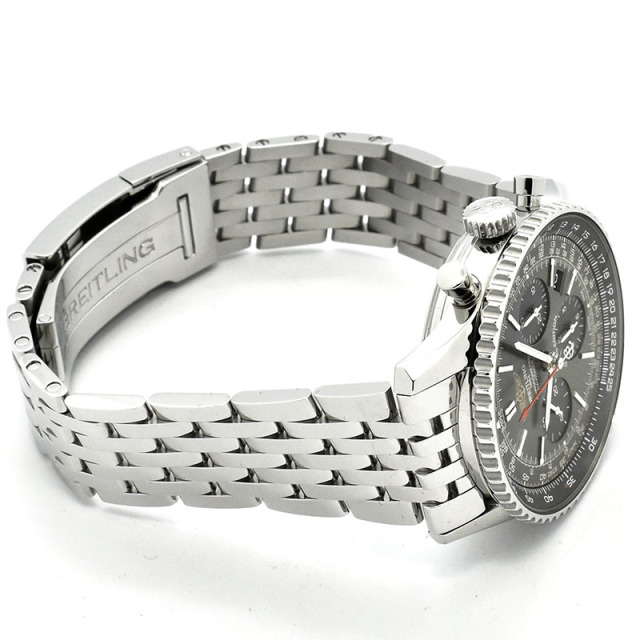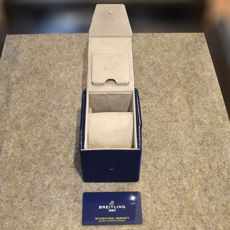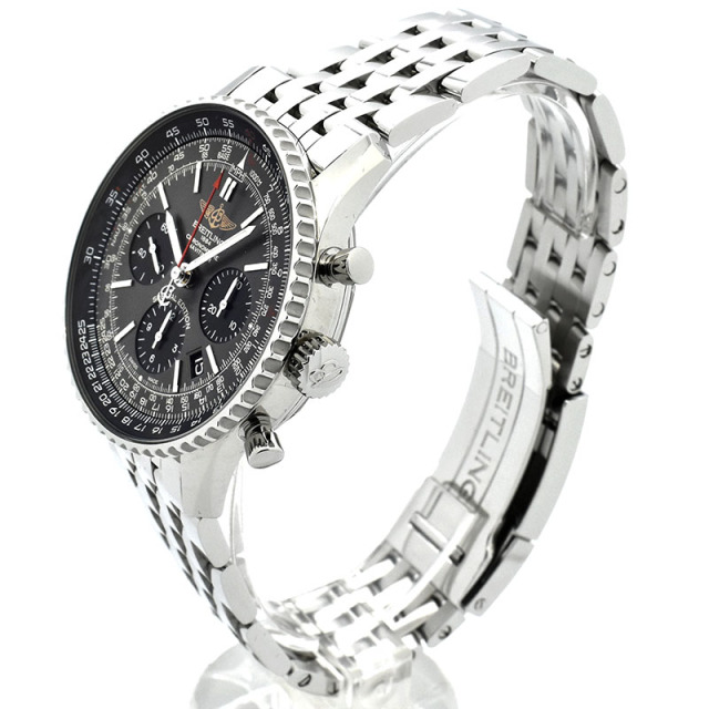 | 店長メモ | 【日本限定】 12時位置には長く愛され続けたウイングロゴが配され、アンスラサイトのダイヤルにブラックのインダイヤルを組み合わせた特別なナビタイマーです。 ムーブメントには自社開発製造のブライトリング01が搭載され、その機械美はスケルトン仕様のケースバックからご覧いただけます。 |