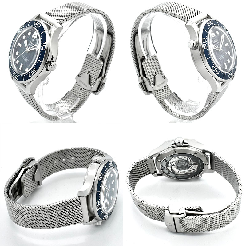 | 店長メモ | ボンド映画60周年を記念して2022年に発表されたシーマスターダイバー300Mのスぺシェルエディションモデルです。 1995年の映画"007/ゴールデンアイ"で着用したモデルと2012年の映画"007/ノー・タイム・トゥ・ダイ"で着用のモデルのブレスレットを組み合わせたようなエレガントな仕上がりです。 ベゼルの12時位置には通常ある逆三角形のマークの代わりに、60周年を記念する"60"の数字が添えられています。 |