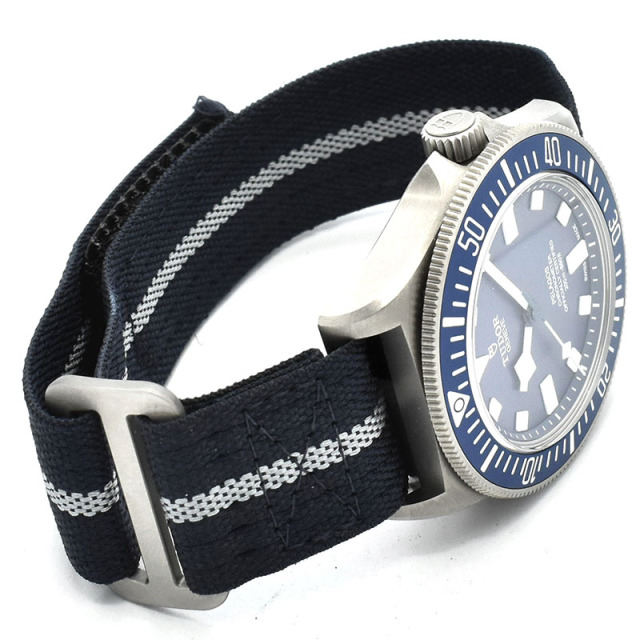 | 店長メモ | フランス海軍の特殊部隊との共同開発で誕生したペラゴス FXD 一塊のブロックから加工し固定されたストラップバーが特徴的で、ケースバックには“Marine nationale”(フランス海軍)が刻印されています。 200m防水を備え、ムーブメントには自社製キャリバーMT5602が搭載されています。 |