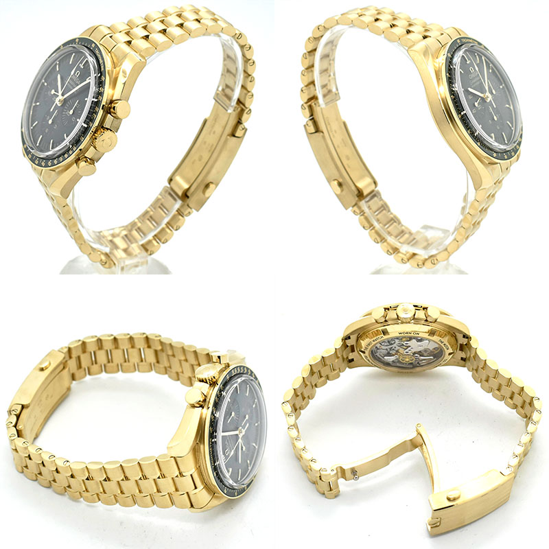 | 店長メモ | 【2021年新作】 オメガを代表するモデルの一つであるムーンウォッチのムーンシャインゴールドモデルです。 ケース素材にはオメガ独自のイエローゴールド合金のムーンシャインゴールドが採用されています。 一般的なイエローゴールドより淡い色合いを持ち、経年変化に強いという特徴を持ちます。 ムーブメントには15000ガウスの耐磁性能を誇りマスタークロノメーター認定ムーブメント"Cal.3861"を搭載。 ベゼルの90の上にはドットが打たれている有名な"ドットオーバー90"が採用されています。 ダイヤルやベゼルにはグリーンカラーが採用され、見る者の目を奪う美しい仕上がりです。/50m防水/サファイアガラス/バックスケルトン |