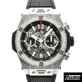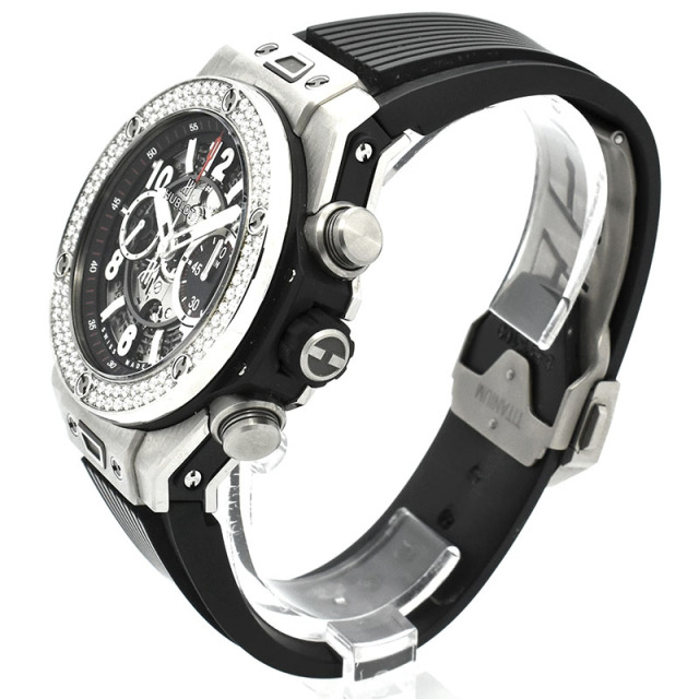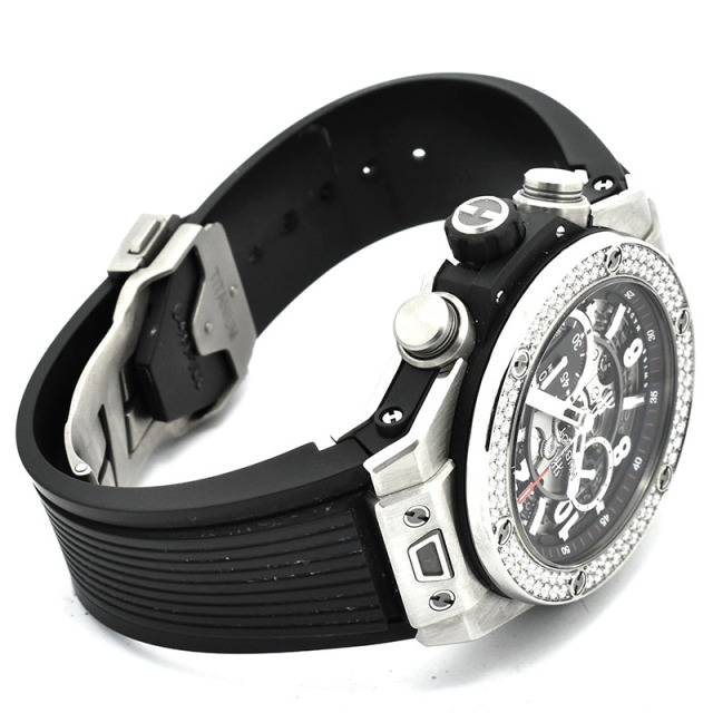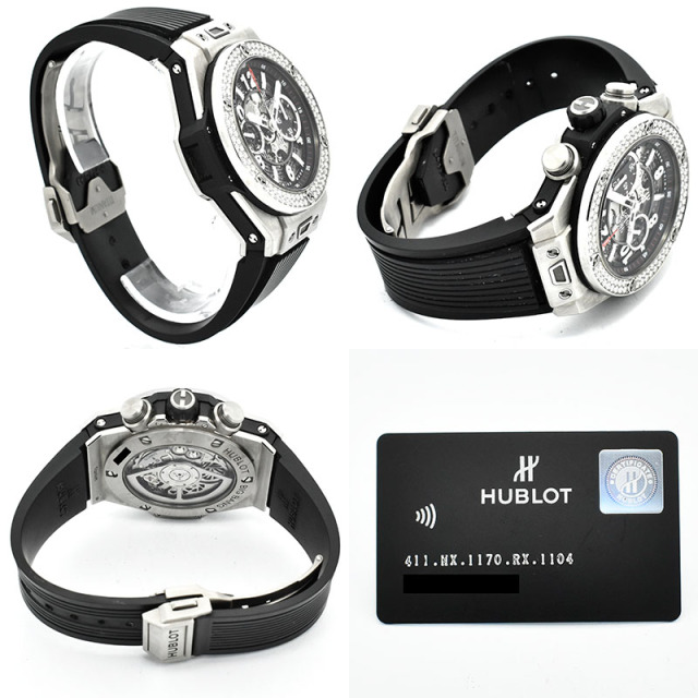 | 店長メモ | 完全自社生産のクロノグラフムーブメント「ウニコ」を搭載。 シースルーの文字盤からはウブロ自慢のウニコの機能美を眺める事が出来、ベゼルにはダイヤをセッティングした煌びやかなモデルです。/100m防水 |