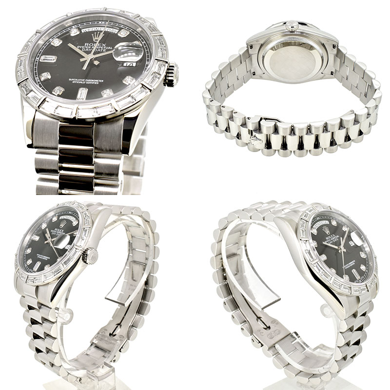 TOPロレックス メンズスタンダード&デイデイト ロレックス ROLEX デイデイト ベゼルバケットダイヤ 118366A プラチナ 36mm K番 USED 中古 参考定価: ¥12,100,000(税込) 価格: ¥5,980,000 (税込) 販売期間: WOC2年保険: 選択してください 加入する(+¥46,200-) 加入しない 数量: 本 在庫: 在庫切れ ※価格は前回価格です。 在庫 在庫切れ ※価格は前回価格です。 WOC2年保険加入する(+¥46,200-)加入しない 商品詳細 DETAILSブランドロレックス ROLEX商品名デイデイト ベゼルバケットダイヤ 118366A状態USED 中古 *当店で外装仕上げ済みです。材質プラチナ機械自動巻文字盤ブラック/ダイヤモンドベルトプラチナ付属品箱 修理明細書 文字盤2つ(シルバー/ダイヤモンド、ブラック)保証6ヶ月腕回り最大約18cm(24コマ)店長メモ【K番】ロレックスのシリーズの中で最上級に位置するデイデイト。ブラックダイヤルにベゼルにはバケットカットされた24個ものダイヤモンドが惜しげもなくセッティングしてあり、高級感、存在感共に群を抜いた仕上がりです。希少なデイデイトのプラチナモデルをお見逃し無く! 【関連商品】 ロレックス ROLEX オイスターパーペチュアル 31 Ref.277200 ターコイズブルー/セレブレーションモチーフ 31mm 新品 ¥1,450,000(税込) 在庫切れ ※価格は前回価格です。 ロレックス ROLEX オイスターパーペチュアル 36 Ref.126000 ターコイズブルー 36mm 新品 ¥2,550,000(税込) 在庫切れ ※価格は前回価格です。 ロレックス ROLEX オイスターパーペチュアル 41 Ref.124300 グリーン 41mm USED 中古 ¥1,550,000(税込) 在庫切れ ※価格は前回価格です。 ロレックス ROLEX デイトジャスト36 Ref.126234G 36mm ブルーフル―テッド 新品 ¥2,050,000(税込) 在庫切れ ※価格は前回価格です。 ロレックス ROLEX ターノグラフ Ref.116261 18KPG×SS ブラック F番ルーレット 36mm USED 中古 ¥1,350,000(税込) 在庫切れ ※価格は前回価格です。 ロレックス ROLEX デイトジャスト サンダーバード Ref.16264 P番 36mm USED 中古 ¥868,000(税込) 在庫切れ ※価格は前回価格です。 ロレックス ROLEX レディ デイトジャスト 28 Ref.279174 ホワイトローマ SS×WG USED 中古 ¥1,198,000(税込) 在庫切れ ※価格は前回価格です。 ロレックス ROLEX デイトジャスト 31 Ref.278341RBR チョコレート/VIダイヤ 新品 参考定価: ¥2,266,000(税込) ¥2,180,000(税込) 在庫切れ ※価格は前回価格です。