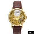 伝統と革新が融合した、ブレゲならではの機械美を堪能できる一本。 香箱やテンプなど主要機構をあえてダイヤル側に露出させたスタイルが特徴的で、動くメカニズムを視覚で楽しめます。 37mmのイエローゴールドケースに、クラシカルなギョーシェ彫りのオフセンター文字盤を配置し、ブレゲ針やローマ数字など、ブランドの伝統的意匠も随所に光ります。 搭載ムーブメントは手巻きキャリバー507DR。 美しい仕上げと表裏のパワーリザーブ表示、ブレゲの代名詞ともいえるパラシュート耐衝撃機構も備えています。 洗練されたサイズ感と立体的な機構美で、ブレゲの真髄を味わえる逸品です。 |