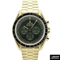 オメガを代表するモデルの一つであるムーンウォッチのムーンシャインゴールドモデルです。 ケース素材にはオメガ独自のイエローゴールド合金のムーンシャインゴールドが採用されています。 一般的なイエローゴールドより淡い色合いを持ち、経年変化に強いという特徴を持ちます。 ムーブメントには15000ガウスの耐磁性能を誇りマスタークロノメーター認定ムーブメント"Cal.3861"を搭載。 ベゼルの90の上にはドットが打たれている有名な"ドットオーバー90"が採用されています。 ダイヤルやベゼルにはグリーンカラーが採用され、見る者の目を奪う美しい仕上がりです。 |
