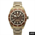 チューダーが1958年に発表した"サブマリーナ ビッグクラウン Ref.7924"からインスピレーションされたのが"ブラックベイ フィフティエイト"になります。 こちらはチューダー初のブティック限定モデルとして、ケースやリューズ、ブレスレットまでブロンズ製のブラックベイ フィフティエイトです。 ブラックベイを象徴するイカサブ針も採用したヴィンテージ感溢れるデザインながら、ムーブメントには自社製キャリバー"MT5400"を搭載しパワーリザーブは70時間を誇ります。 |