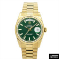 一目で高貴さを伝える18Kイエローゴールド製ケースとプレジデントブレスレットが特徴のロレックスの最上コレクションの一つです。 グリーン文字盤は希少価値が高く、視認性の高いバーインデックスと相まって、ラグジュアリーな中にも確かな存在感を放ちます。 自動巻きキャリバー3155を搭載し、曜日・日付表示が瞬時に切り替わる実用性にも優れた、洗練されたステータスウォッチです。 |