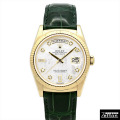 18Kイエローゴールド製36mmケースに、神秘的なホワイトマザーオブパールの文字盤と10ポイントのダイヤモンドインデックスをあしらい、見る角度によって表情を変える美しさが印象的です。 自動巻きキャリバー3155を搭載し、曜日・日付表示が瞬時に切り替わる実用性にも優れた、洗練されたステータスウォッチです。 |