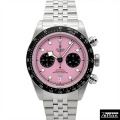 柔らかなピンク文字盤に、深く引き締まるブラックのインダイヤルを配した1本です。 ブラックの積算計が引き締め役となり、全体の色調にコントラストを加え、文字盤全体の視認性とデザインバランスを高めています。 伝統のタキメーターベゼル、COSC認定ムーブメント"キャリバー MT5813"による約70時間パワーリザーブなど、仕様面もしっかり充実しています。 ピンク/ブラックという意外性のあるカラーリングを、確かな時計技術とともに楽しみたい方におすすめです。 |