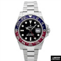 初期を彷彿とさせる赤/青ベゼルのGMTマスター、通称「ペプシ」モデルです。 ベゼルの素材にはセラミックが用いられ、見た目だけではなく対傷性等にも優れた仕上がりになっております。 GMT(2カ国の時間表示)機能付きでビジネスや海外旅行でも安心で、100メートル防水と実用性も抜群のモデルです。 |