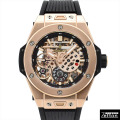 ウブロの自社ムーブメント「HUB1201」を搭載し、香箱を2つ並列したツインバレル式で10日間のパワーリザーブを誇ります。 ケースやベゼルにはキングゴールドが採用され、通常のゴールドに比べ赤い色調を持つ魅力的なモデルです。 |