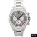 18Kホワイトゴールドケースにダイヤモンドベゼルを組み合わせた、ラグジュアリー仕様のデイトナ。 ダイヤルはブラック&ホワイトのマザーオブパールで、光の角度により表情が大きく変わる独特の質感が魅力です。 インデックスにはダイヤモンドとクロマライトを配し、華やかさと視認性を両立。 クロノグラフの王道デザインに、ジュエリーのような輝きを重ねた特別な一本です。 |