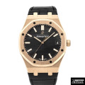 18Kピンクゴールドの41mmケースに、ブラックの「グランドタペストリー」ダイヤルを合わせたラグジュアリーなロイヤルオーク。 ワイドなインデックスや外周のミニッツトラック、中心から距離をとったデイト表示など、現行らしいディテールが端正な顔立ちを引き締めます。 ムーブメントはCal.4302を搭載し、サファイアケースバックからその仕上げも鑑賞頂けます。 ブラックストラップと18Kピンクゴールド製フォールディングバックルが、スポーティさの中に品格を添える一本です。 |