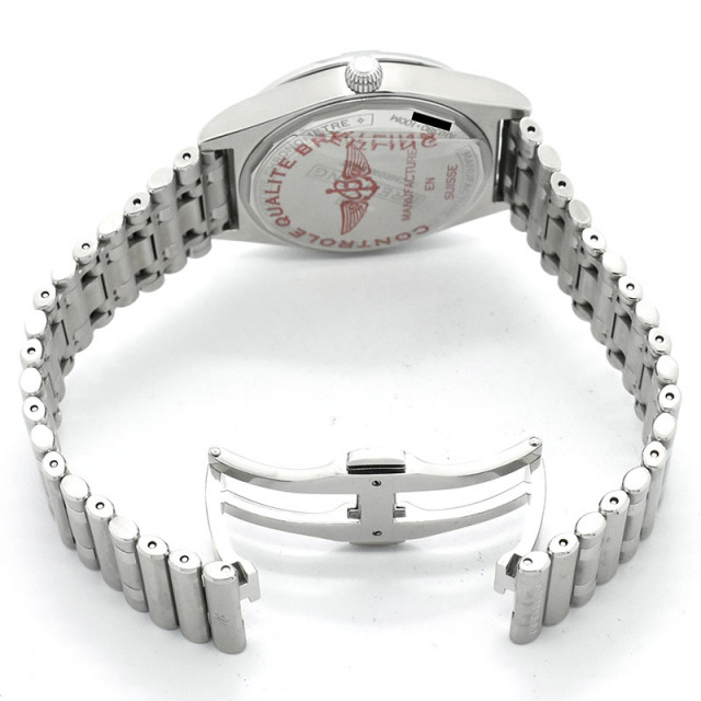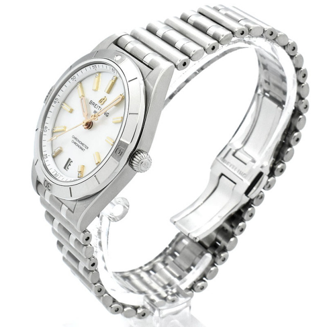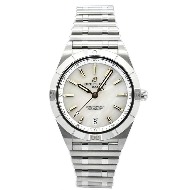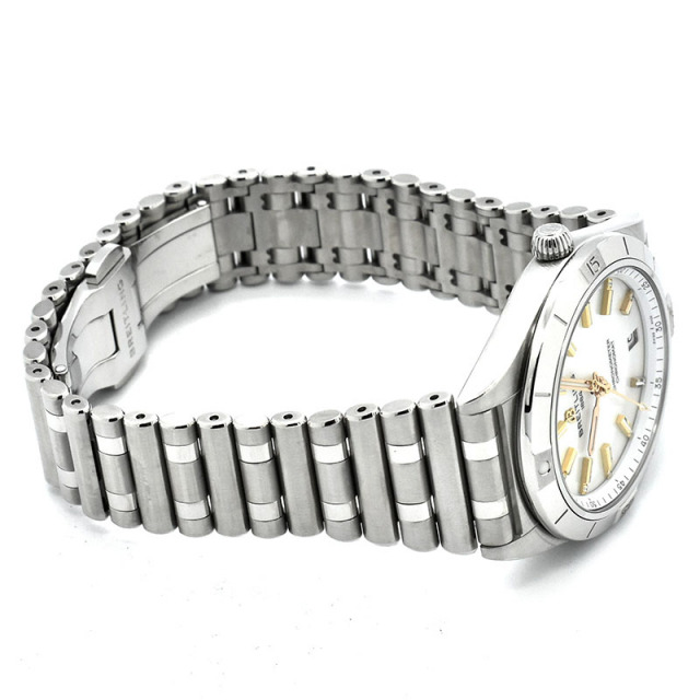 店長メモ ホワイトシェルダイヤルに個性的なルーローブレスレットを組み合わせ、ムーブメントにはブライトリングキャリバー10を搭載しています。