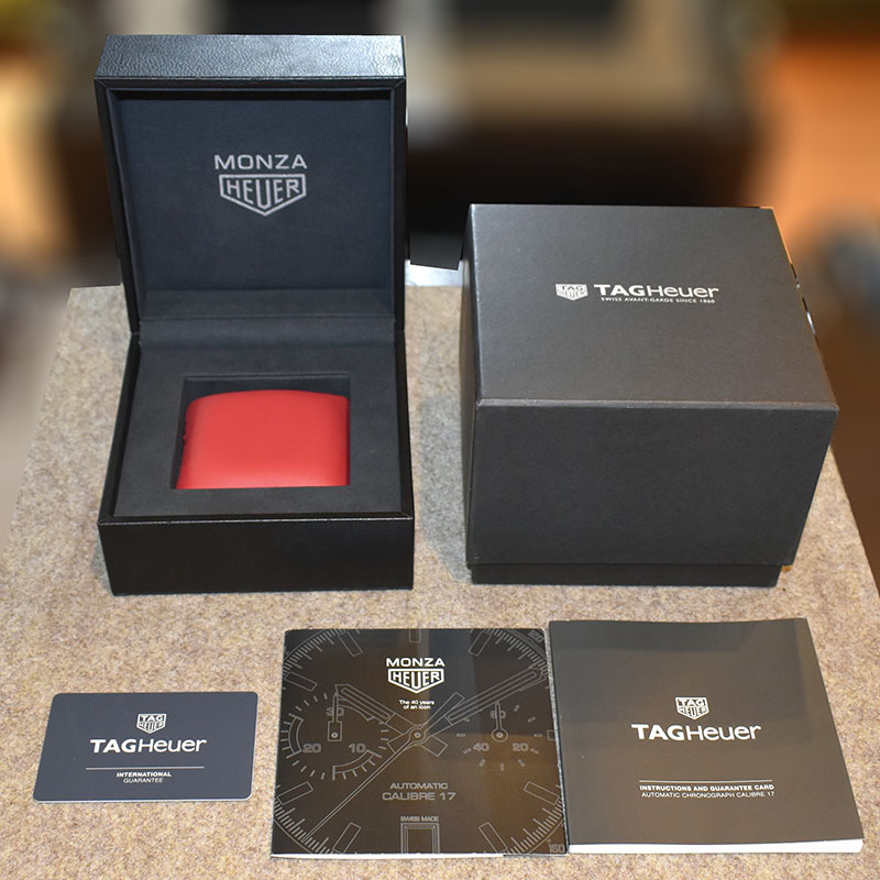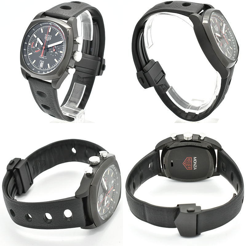 | 店長メモ | 【モンツァ40周年記念モデル】 1976年フェラーリのニキ・ラウダが初めて世界チャンピオンを獲得した事を記念に製作されたのがモンツァです。 42mmのクッション型ケースに自動巻クロノグラフムーブメント「キャリバー17」を搭載しています。 100m防水/パルスメーター |