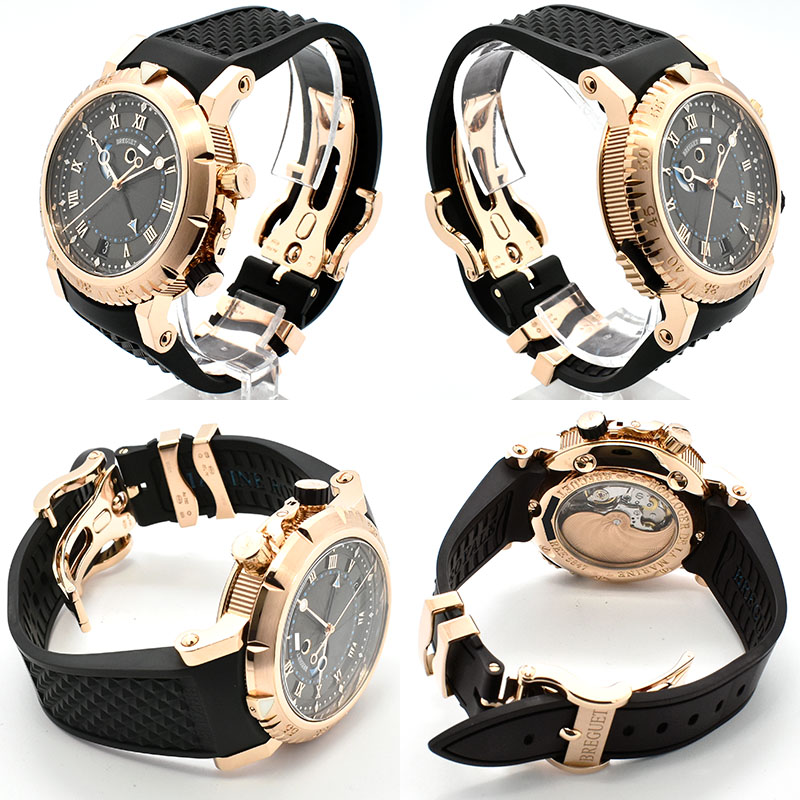 | 店長メモ | アラーム機能を搭載したマリーンロイヤルは7時位置のボタンで12時位置にアラームのON・OFFの表示が可能で、コインエッジやブレゲ針等ブレゲらしさも搭載した仕上がりです。/300m防水 |