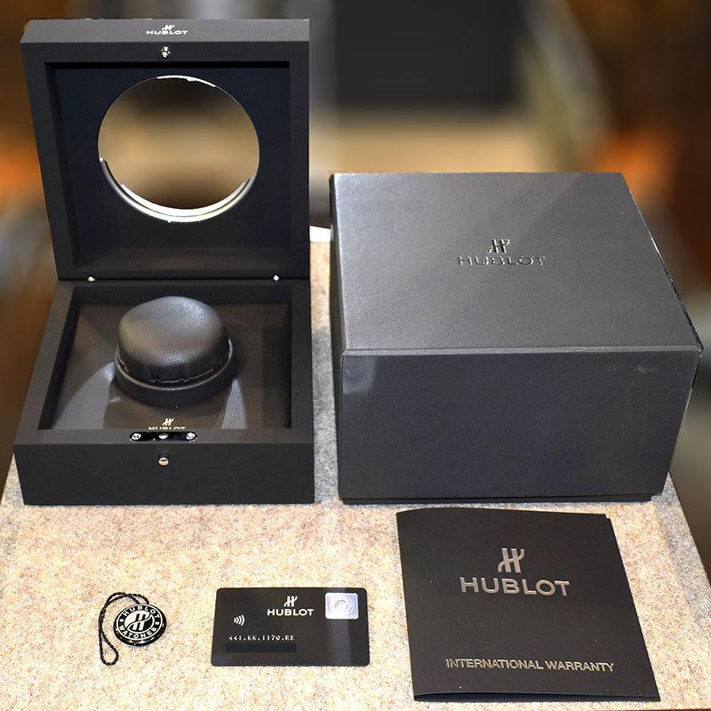 | 店長メモ | 完全自社生産のクロノグラフムーブメント「ウニコHUB1280」を搭載。 シースルーの文字盤からは、ウブロ自慢のウニコの機械美を眺める事が出来ます。 定番の45mmより一回り小さく使いやすいサイズになっています。/100m防水 |