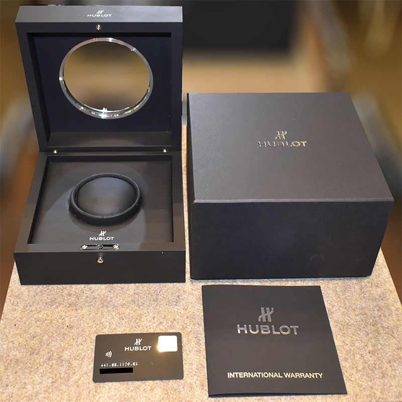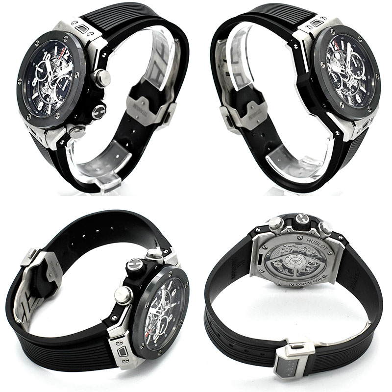 | 店長メモ | 完全自社生産のクロノグラフムーブメント「ウニコHUB1280」を搭載。 シースルーの文字盤からは、ウブロ自慢のウニコの機械美を眺める事が出来ます。 定番の45mmより一回り小さく使いやすいサイズになっています。/100m防水 |