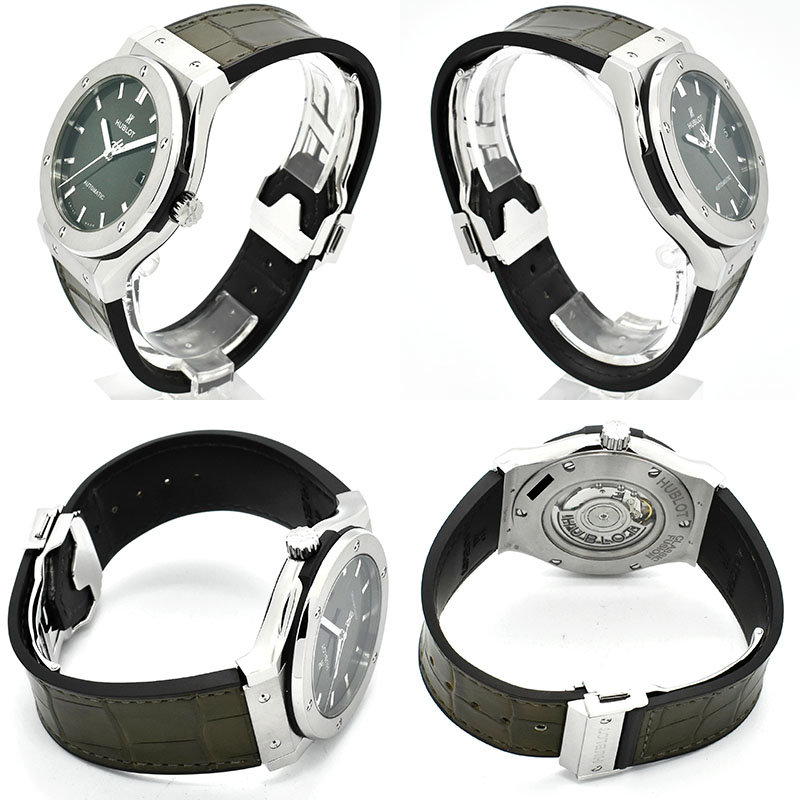 | 店長メモ | 45mmのチタンケースに自動巻ムーブメントを搭載したクラシックフュージョンはウブロが創業以来大切にしてきたデザインです。 こちらはグリーンダイアルにグリーンのアリゲーターベルトを組み合わせた1本です。/50m防水 |