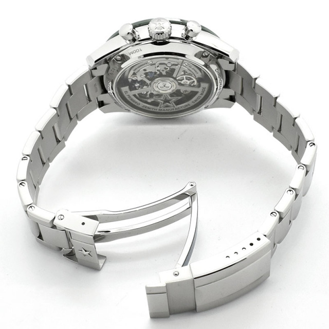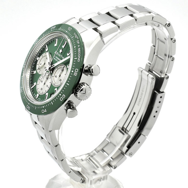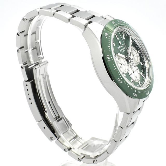 | 店長メモ | 【2023年新作】【244本限定】 こちらはダイヤルカラーにグリーンラッカーを採用した限定仕様のモデルです。 最も有名なムーブメントの一つ"エルプリメロ"の新バージョン、3600キャリバーが搭載され、セラミック製ベゼルには1/10秒単位のスケールが刻まれ、クロノグラフによる経過時間の視認性に優れています。 パワーリザーブは約60時間を誇り、その新しいエルプリメロの機械美はスケルトン仕様のケースバックからご覧いただけます。 新しいゼニスの始まりとも言えるその完成度は正に必見です。/100m防水 |