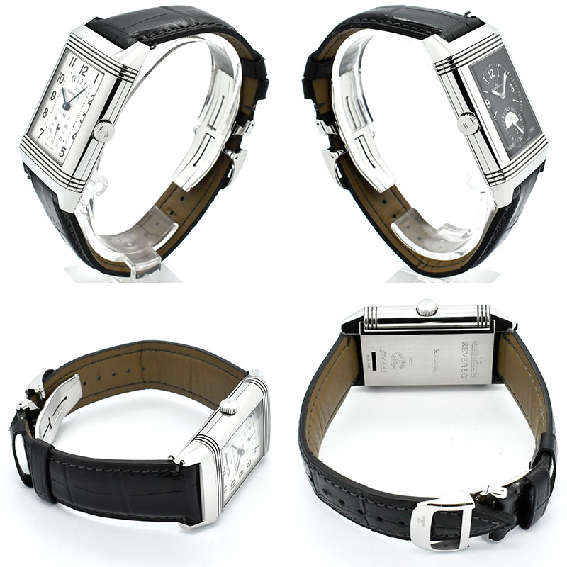 | 店長メモ | 反転するケースが特徴のレベルソコレクション。 こちらは表と裏で2つの時間表示が可能なデュオモデルです。 2つの文字盤のカラーが異なるので1本で2本分の楽しみが得られ、ナイト&デイ表示やデイト表示も搭載したハイスペックでエレガントな1本です。 レベルソの中でも大振りなケースサイズで、1500本のみ生産された希少な限定モデルです。 |