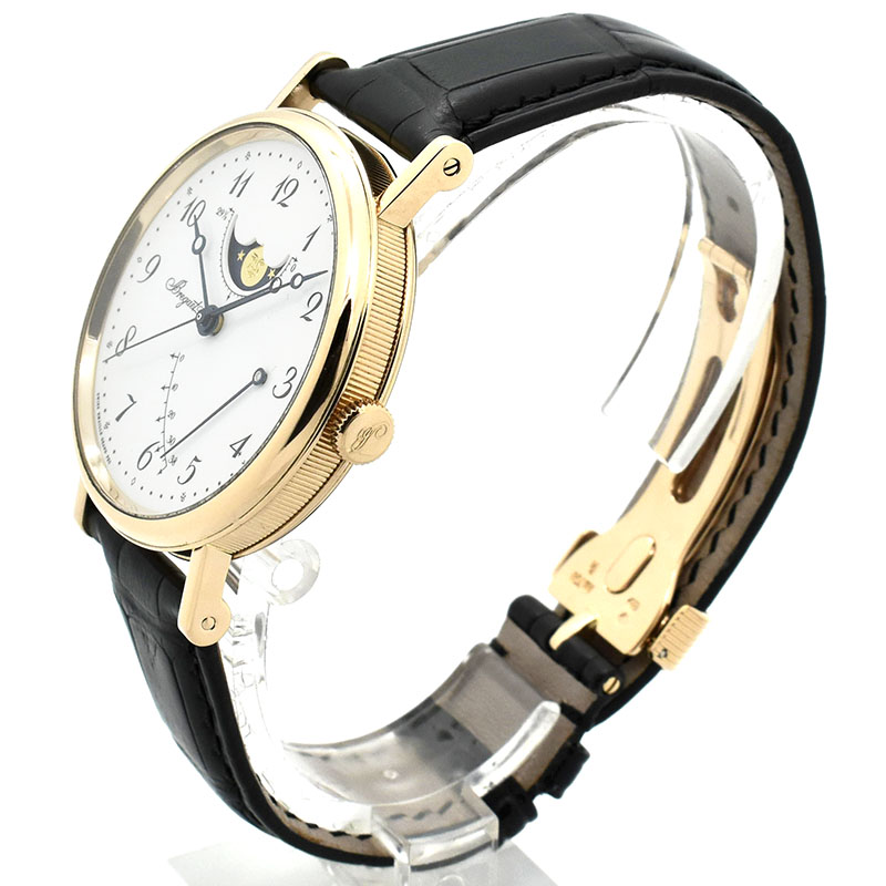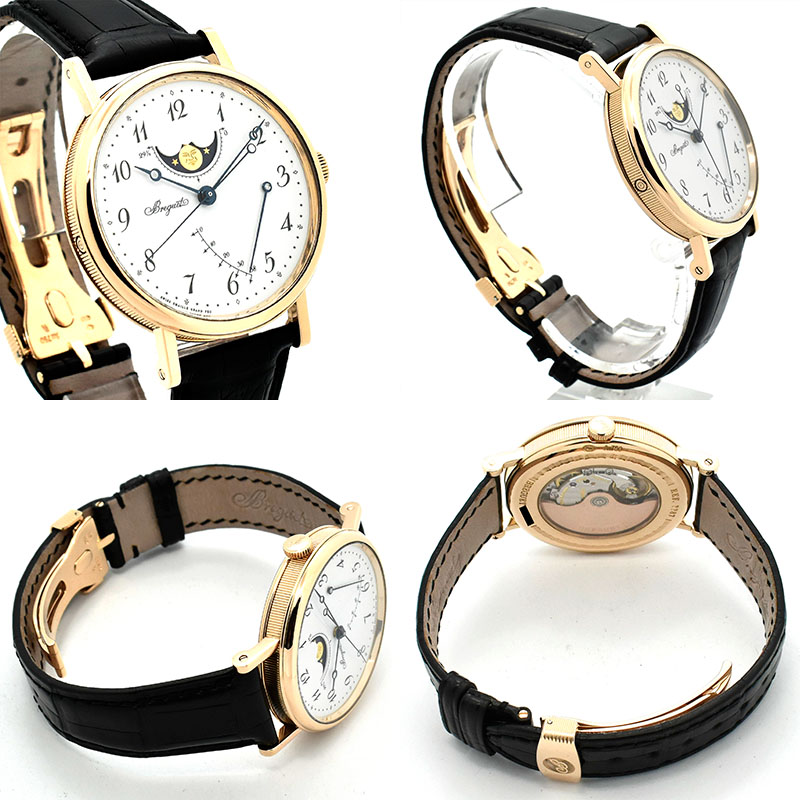 | 店長メモ | コインエッジやブレゲ針といったブレゲファンならずもたまらないデザインに加え、あらゆるシチュエーションでホワイトエナメルダイヤルを組み合わせたモデルです。 12時位置にはムーンフェイズ、ダイヤルの下方にはパワーリザーブを配置させたシンプルでエレガントな仕上がりです。 |