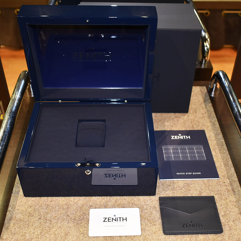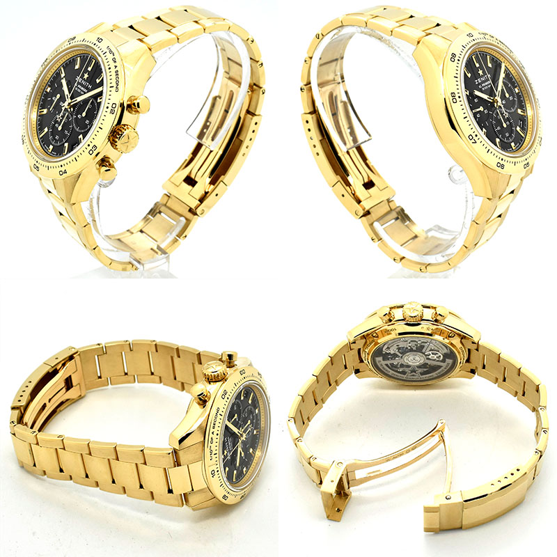 | 店長メモ | 【2024年新作】 こちらはダイヤルカラーをブラックで統一したスペシャルエディションモデルです。 最も有名なムーブメントの一つ"エルプリメロ"の新バージョン、3600キャリバーが搭載され、イエローゴールド製ベゼルには1/10秒単位のスケールが刻まれ、クロノグラフによる経過時間の視認性に優れています。 パワーリザーブは約60時間を誇り、その新しいエルプリメロの機械美はスケルトン仕様のケースバックからご覧いただけます。 新しいゼニスの始まりとも言えるその完成度は正に必見です。/100m防水 |