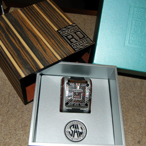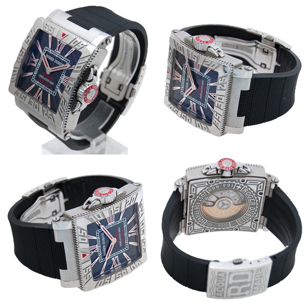 | 店長メモ | ゴールデンスクエアーがベースになっているアクアマーレはスクエアケース、バックスケルトンと言う仕様ながらも300mもの防水性を誇るハイスペックモデル。世界888本限定モデル。 |