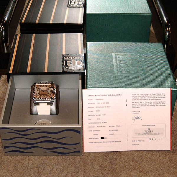 | 店長メモ | ゴールデンスクエアーがベースになっているアクアマーレはスクエアケース、バックスケルトンと言う仕様ながらも300mもの防水性を誇るハイスペックモデル。/ケース径41mm/自動巻き |