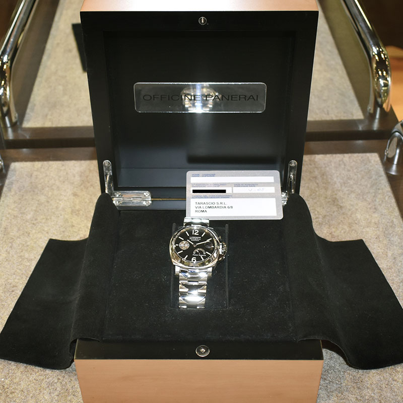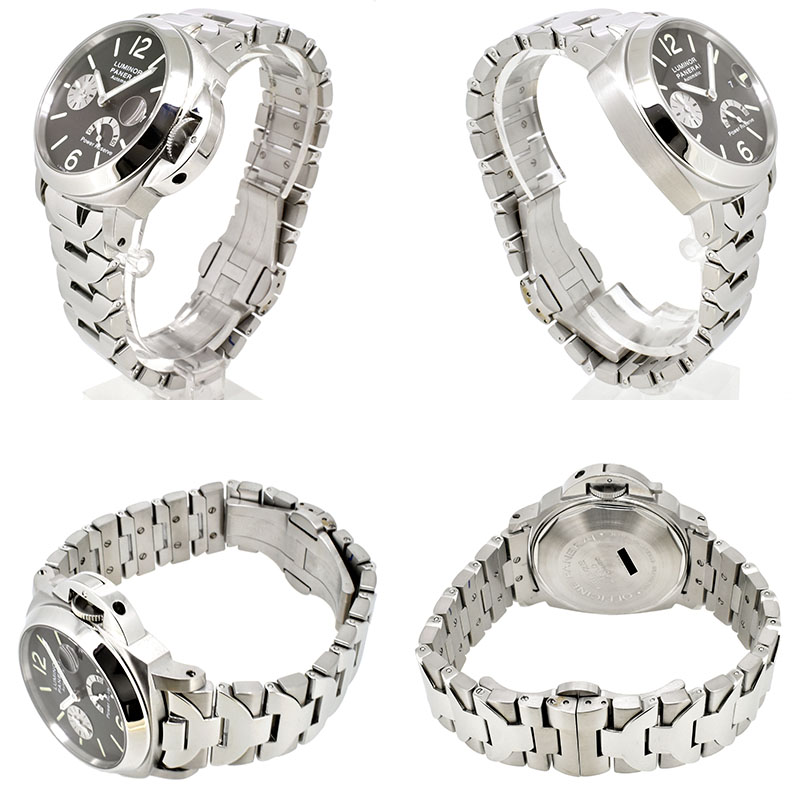 | 店長メモ | 【G番2004年製】40mmのルミノールマリーナ パワーリザーブモデルです。3時位置にデイト表示、9時位置にスモールセコンドを備え、300m防水にサファイアガラスと実用面も申し分ございません。 |