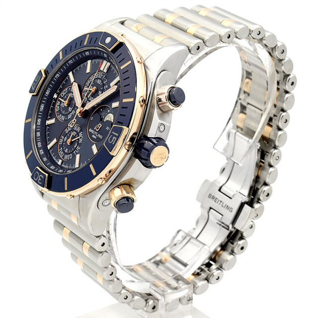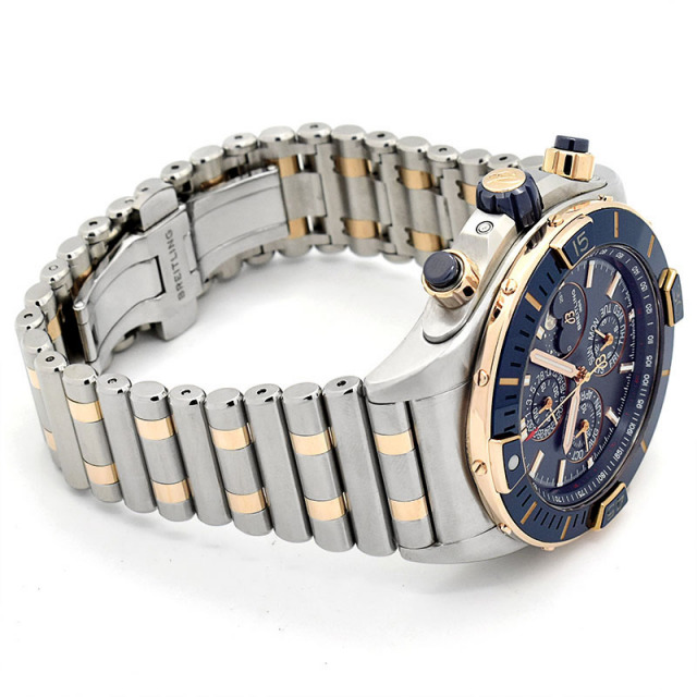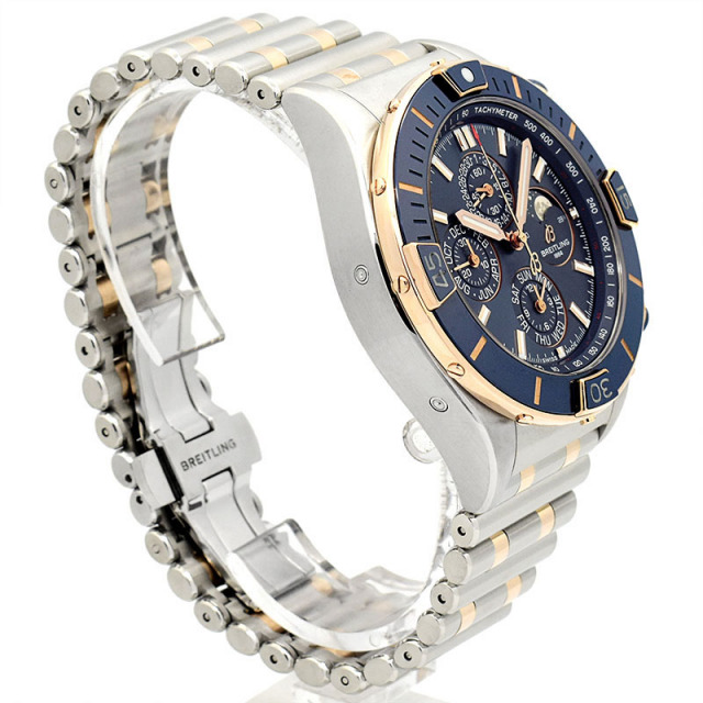 ブルーダイヤルに個性的なルーローブレスレットを組み合わせ、セミパーペチュアルカレンダームーブメントであるキャリバーブライトリング19を搭載しています。 4年に一度の閏年のある年以外はカレンダー調整が必要なく、時計が稼働している限りは自動的に表示が切り替わってくれる複雑機構です。 |