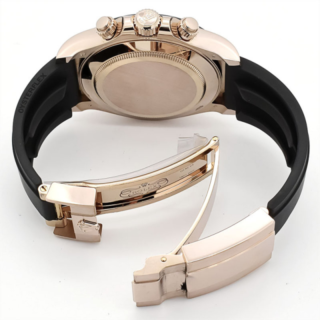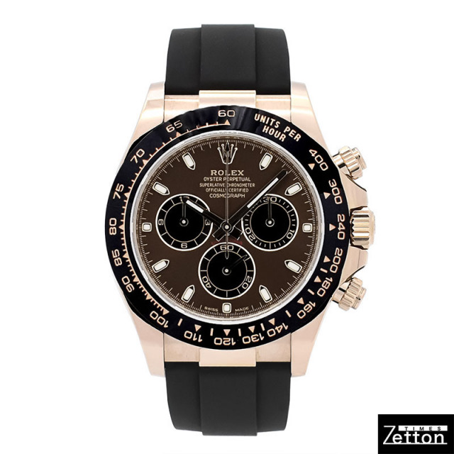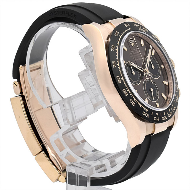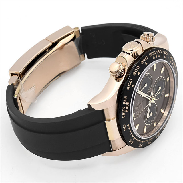デイトナのエバーローズゴールドモデルにブラックセラミックベゼルが採用され、ケースとのコントラストが非常に美しい1本です。 こちらはコレクションの中でも特に人気の高かったチョコレート/ブラックダイヤルです。/100m防水 |